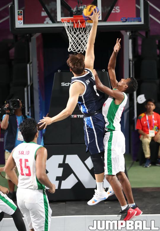 한국 3x3 남자농구 대표팀이 25일(한국시간) 인도네시아 자카르타 GBK 테니스 코트에서 열린 2018 자카르타-팔렘방 아시안게임 3x3 남자농구 예선 방글라데시와의 경기, 한국의 안영준이 중앙을 파고 들며 원 핸드 덩크슛을 시도하고 있다.