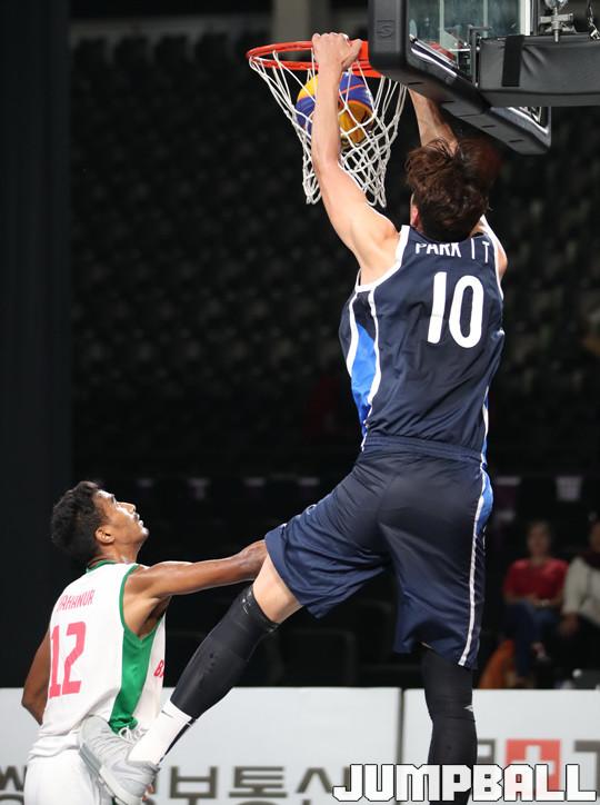 한국 3x3 남자농구 대표팀이 25일(한국시간) 인도네시아 자카르타 GBK 테니스 코트에서 열린 2018 자카르타-팔렘방 아시안게임 3x3 남자농구 예선 방글라데시와의 경기, 한국의 박인태가 아리우프 덩크슛으로 21점째를 얻어내며 경기를 마무리 지었다.
