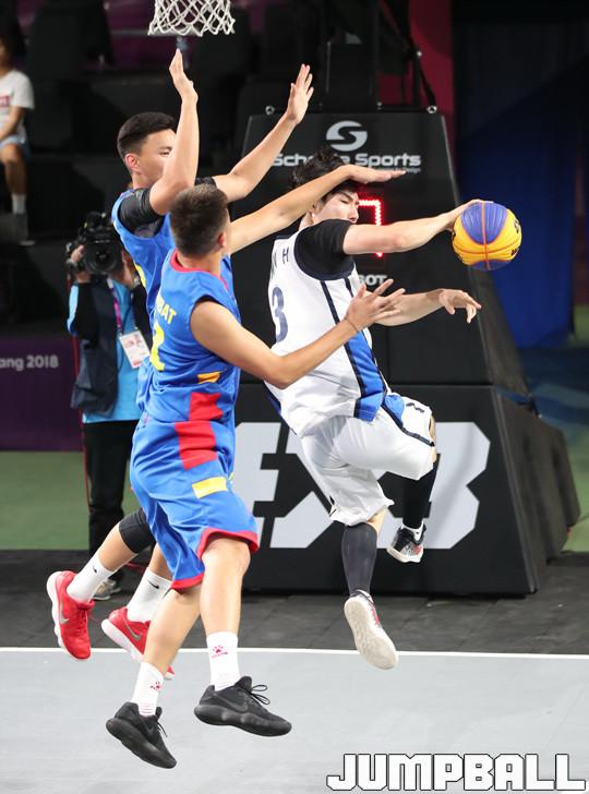 한국 3x3 남자농구 대표팀이 25일(한국시간) 인도네시아 자카르타 GBK 테니스 코트에서 열린 2018 자카르타-팔렘방 아시안게임 3x3 남자농구 예선 몽골과의 경기, 돌파를 시도해 상대 수비를 자신에게 집중시킨 뒤 외곽에 있는 선수에게 패스를 해주고 있다.