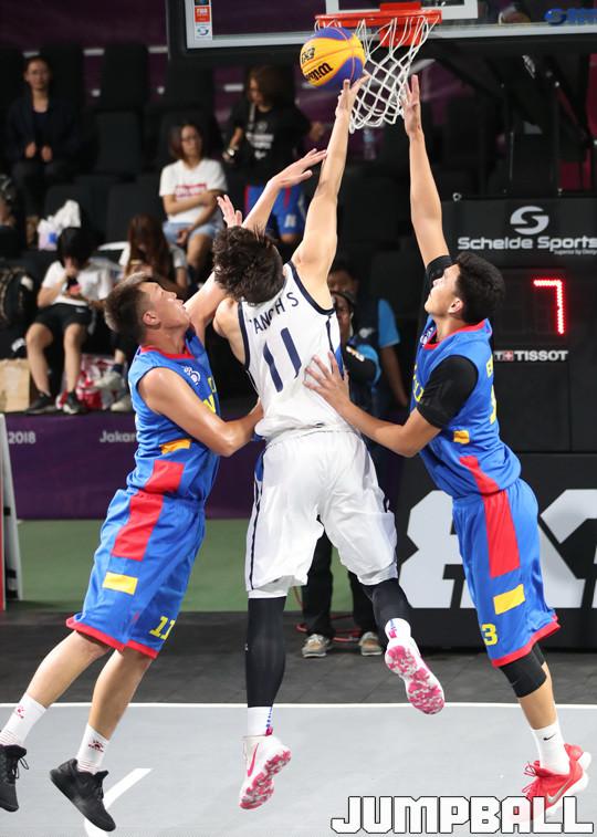 한국 3x3 남자농구 대표팀이 25일(한국시간) 인도네시아 자카르타 GBK 테니스 코트에서 열린 2018 자카르타-팔렘방 아시안게임 3x3 남자농구 예선 몽골과의 경기, 양홍석이 상대 수비 사이를 파고 들어 득점을 만들고 있다.