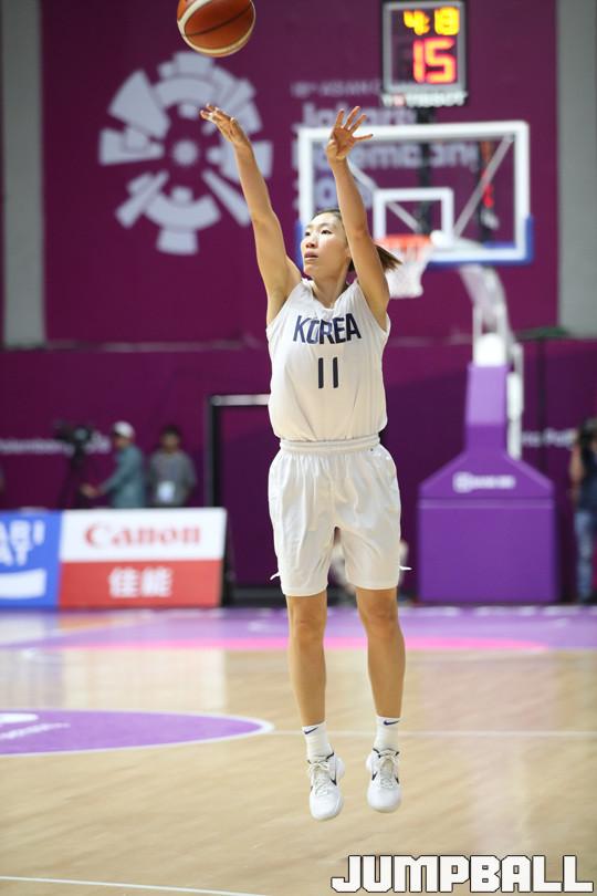 여자농구대표팀 코리아는 26일(이하 한국시간) 인도네시아 자카르타 겔로라 붕 카르노(GBK) 농구장에서 열린 2018 자카르타-팔렘방 아시안게임 여자농구 8강 태국과의 경기, 코리아팀의 임영희가 외곽에서 볼을 잡자 마자 곧바로 슛을 시도하고 있다.