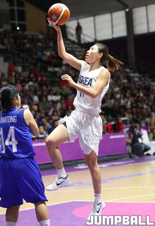 여자농구대표팀 코리아는 26일(이하 한국시간) 인도네시아 자카르타 겔로라 붕 카르노(GBK) 농구장에서 열린 2018 자카르타-팔렘방 아시안게임 여자농구 8강 태국과의 경기, 코리아팀의 임영희가 완벽하게 레이업슛을 시도하고 있다.