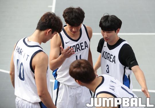 26일(한국시간) 인도네시아 자카르타 GBK 야외 테니스 코트에서 열린 2018 자카르타-팔렘방 아시안게임 남자농구 카자흐스탄과의 8강전, 경기 시작 전 한국 선수들이 모여 경기에 대해 이야기를 하고 있다.