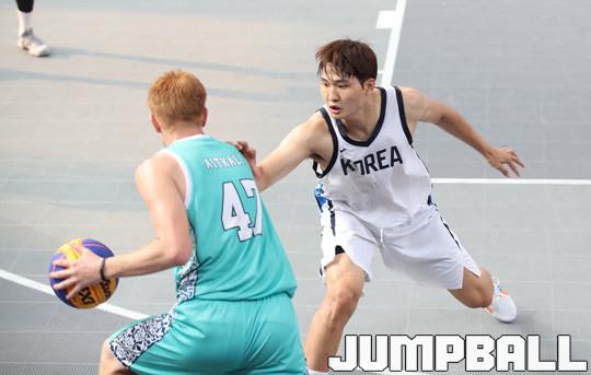 26일(한국시간) 인도네시아 자카르타 GBK 야외 테니스 코트에서 열린 2018 자카르타-팔렘방 아시안게임 남자농구 카자흐스탄과의 8강전, 한국 대표팀의 안영준이 상대 공격을 막아내기 위해 바짝 붙어 수비를 펼치고 있다.
