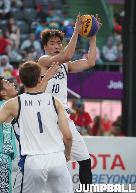 26일(한국시간) 인도네시아 자카르타 GBK 야외 테니스 코트에서 열린 2018 자카르타-팔렘방 아시안게임 남자농구 카자흐스탄과의 8강전, 한국 대표팀의 박인태가 골밑에서 높이와 탄력을 이용해 리바운드를 잡아내고 있다.