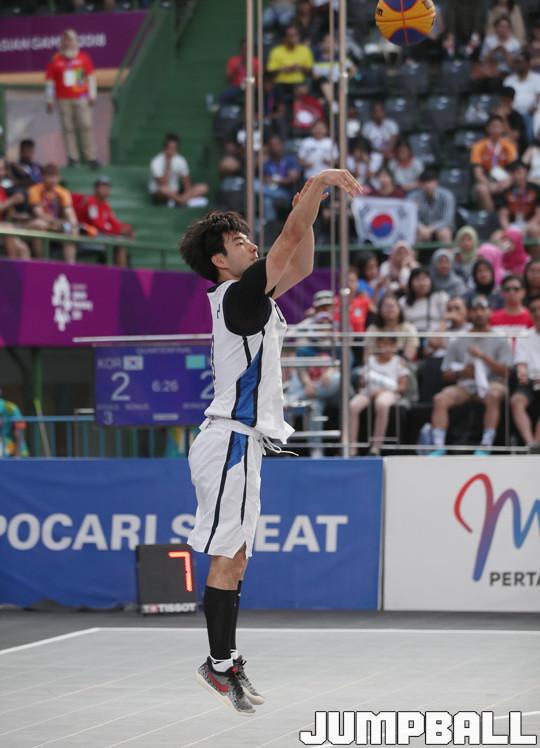 26일(한국시간) 인도네시아 자카르타 GBK 야외 테니스 코트에서 열린 2018 자카르타-팔렘방 아시안게임 남자농구 카자흐스탄과의 8강전, 한국 대표팀의 김낙현이 한 박자 빠른 슛 타이밍으로 2점슛을 던지고 있다.