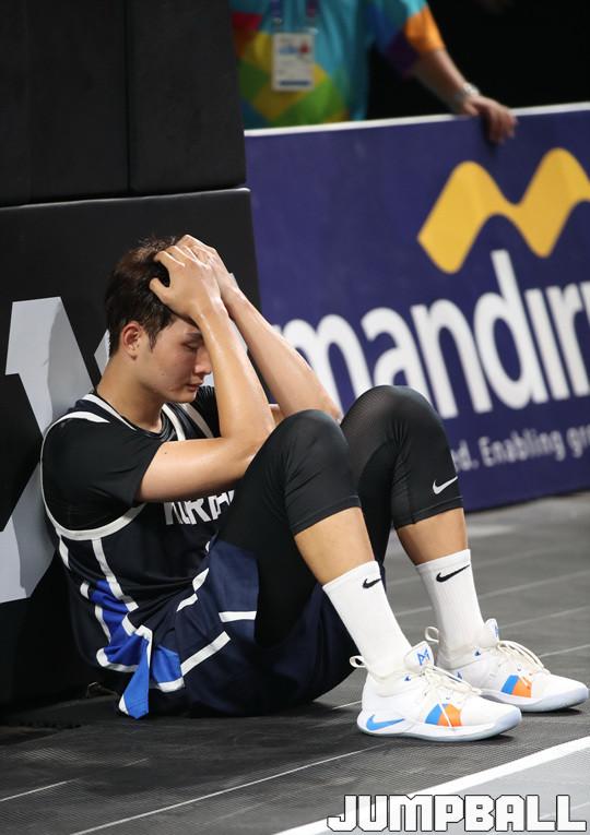 26일(한국시간) 인도네시아 자카르타 GBK 야외 테니스 코트에서 열린 2018 자카르타-팔렘방 아시안게임 남자농구 중국과의 결승전, 한국의 안영준이 패배가 믿기지 않는 듯 괴로워 하고 있다.
