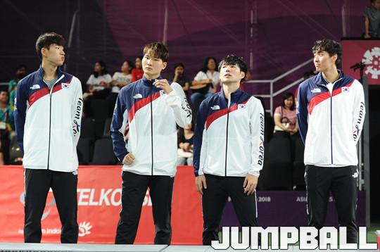 26일(한국시간) 인도네시아 자카르타 GBK 야외 테니스 코트에서 열린 2018 자카르타-팔렘방 아시안게임 남자농구 중국과의 결승전에서 한국 대표팀이 18-19로 석패했다. 시상식에 나선 네 명의 선수들이 아쉬운 마음을 드러내고 있다.