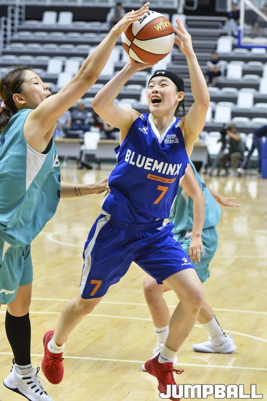[점프볼=수원/홍기웅 기자] 27일 서수원칠보체육관에서 열린 '2018 우리은행 박신자컵 서머리그' KEB하나은행과 삼성생명의 경기. 삼성생명 강계리가 골밑슛을 올리는 도중 블록 슛을 당하고 있다.