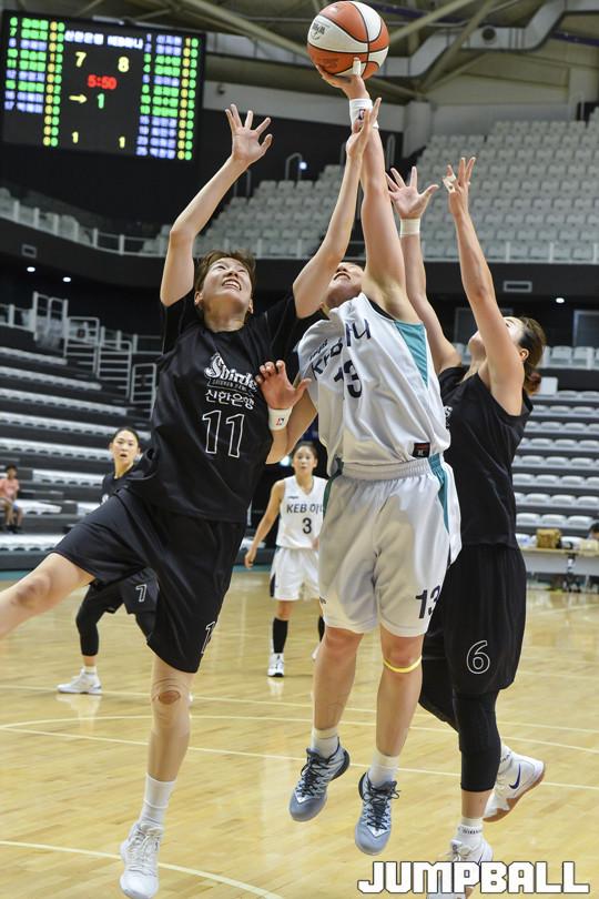 [점프볼=수원/홍기웅 기자] 28일 서수원칠보체육관에서 열린 '2018 우리은행 박신자컵 서머리그' KEB하나은행과 신한은행의 경기. KEB하나은행과 신한은행이 치열하게 리바운드 경쟁을 펼치고 있다.