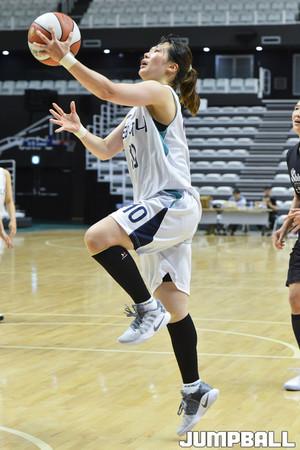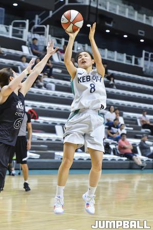 [점프볼=수원/홍기웅 기자] 28일 서수원칠보체육관에서 열린 '2018 우리은행 박신자컵 서머리그' KEB하나은행과 신한은행의 경기. KEB하나 이하은이 공격 시간에 쫓기며 슛을 던지고 있다.
