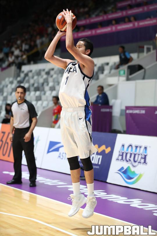 1일(한국시간) 인도네시아 자카르타 GBK 이스토라 체육관에서 열린 2018 자카르타-팔렘방 아시안게임 남자농구 한국과 대만의 동메달 결정전 경기, 한국의 전준범이 타점 높은 3점슛을 시도하고 있다.