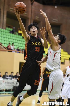 [점프볼=수원/홍기웅 기자] 11일 성균관대학교 수원캠퍼스 체육관에서 열린 '2018 KUSF 대학농구 U-리그' 성균관대와 상명대의 경기. 상명대 전성환이 더블클러치로 수비를 따돌리며 슛을 올리고 있다.