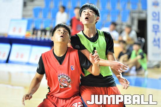 경기에 출전한 중등부 선수들이 박스아웃을 치열하게 하고 있다.