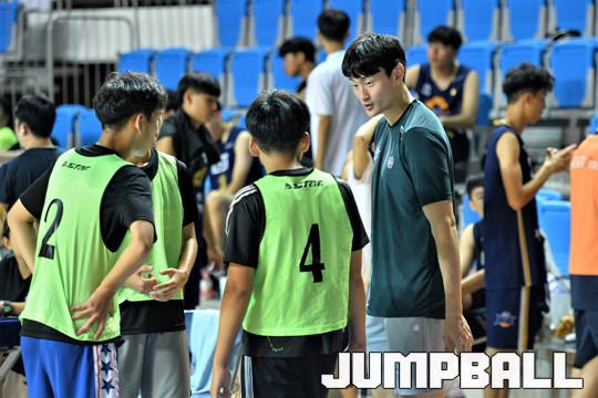 경기에 참여한 중등부 선수들을 위해 특별히 객원 감독이 된 김국찬 감독이 선수들에게 지시를 내리고 있다.