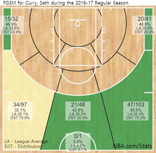커리는 슈터, 커리 집안의 DNA 보유자답게 3점슛을 앞세운 폭발적인 득점력으로 댈러스 백코트진에 경쟁력을 더했다. FAN SIDED의 보도에 따르면 커리 본인은 코트 양쪽 90도 윙 사이드에서 던지는 슛이 가장 편하다고 말하지만 아래의 2016-2017시즌 정규리그, 커리의 3점슛 성공률 분포도를 살펴본다면 외곽 전역에서 고른 외곽 슛 성공률을 기록, 슈터는 자리를 가리지 않는다는 것을 보여줬다.(*커리는 2016-2017시즌 평균 42.5%(평균 2개 성공)의 3점슛 성공률을 기록했다)