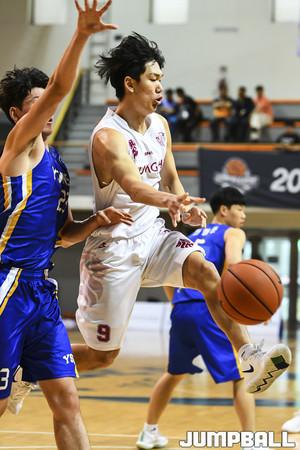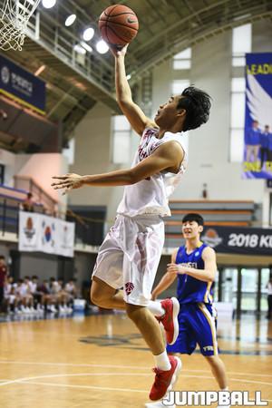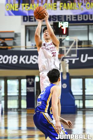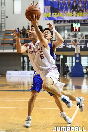 [점프볼=신촌/홍기웅 기자] 19일 연세대학교 신촌캠퍼스 체육관에서 열린 '2018 KUSF 대학농구 U-리그' 연세대와 경희대의 경기. 경희대 김동준이 드리블을 펼치며 주변을 살피고 있다.
