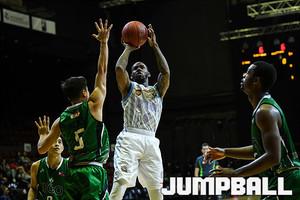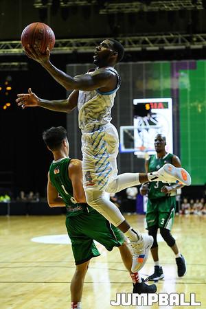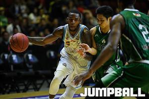 신장 플라잉 타이거스와 아에코 그린 워리어스의 경기, 신장 다리우스 아담스가 수비와의 대치상황에서 레이업을 올리고 있다.