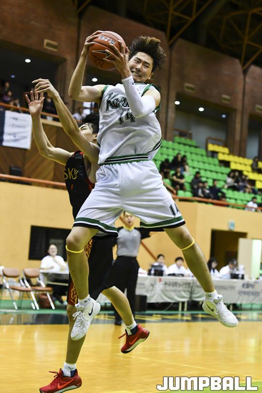 [점프볼=수원/홍기웅 기자] 21일 성균관대학교 자연과학캠퍼스 체육관에서 열린 '2018 KUSF 대학농구 U-리그' 성균관대와 건국대의 경기. 건국대 주현우가 높은 점프력을 동반해 리바운드를 잡고 있다.