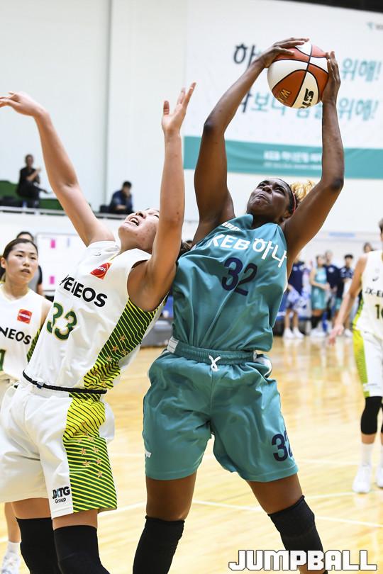 [점프볼=용인/홍기웅 기자] 28일 용인 하나은행 연습체육관에서 KEB하나와 일본 JX의 경기가 열렸다. KEB하나 샤이엔 파커가 리바운드 경합에서 리바운드를 잡아내고 있다.