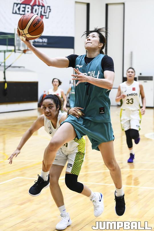 [점프볼=용인/홍기웅 기자] 28일 용인 하나은행 연습체육관에서 KEB하나와 일본 JX의 경기가 열렸다. KEB하나 고아라가 레이업으로 동점골을 득점하고 있다.