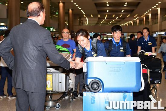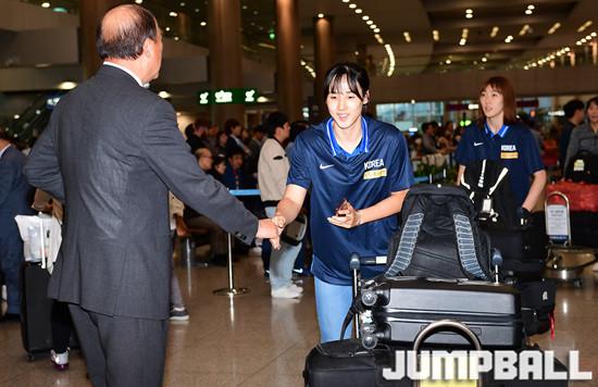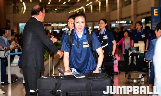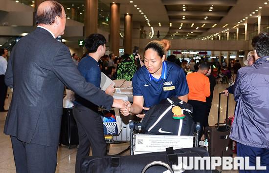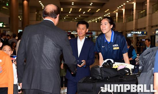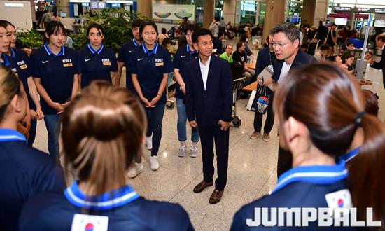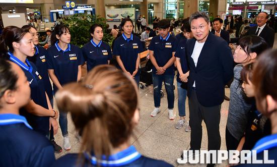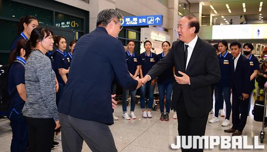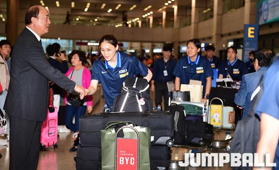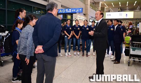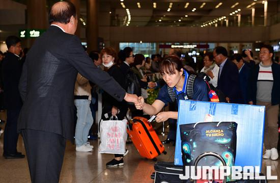 [점프볼=인천공항 /문복주 기자] 한국여자농구 대표팀은 28일 스페인 테네리페 열린 2018 국제농구연맹(FIBA) 여자농구월드컵을 참가해서 세계농구의 벽을 실감하고 인천공항에 도착한 대표팀을 대한농구협회 박한 부회장이 선수단 격려를 했다.