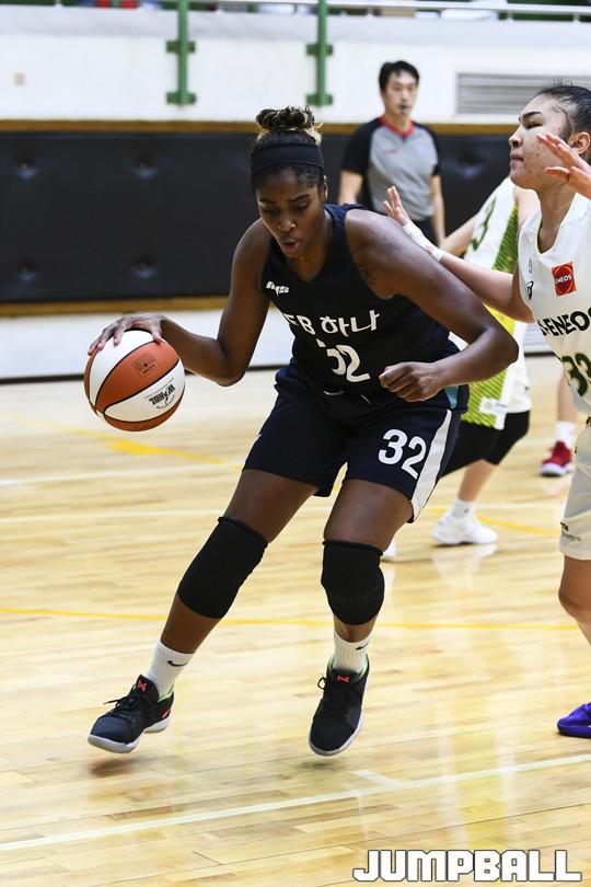 [점프볼=용인/홍기웅 기자] 1일 용인 하나은행 연습체육관에서 KEB하나와 일본 JX의 경기 지난주에 이어 2차전 연습경기가 열렸다. KEB하나 샤이엔 파커가 포스트업으로 골밑으로 들어가고 있다.