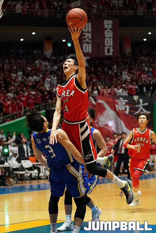 [점프볼=잠실/유용우 기자] 5일 잠실 실내체육관에서 열린 2018 정기전, 고려대 김진영이 수비를 두고 레이업을 시도하고 있다.