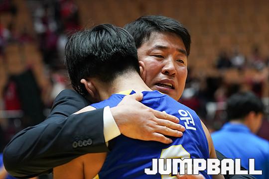 [점프볼=잠실/유용우 기자] 5일 잠실 실내체육관에서 열린 2018 정기전, 연세대가 72-69로 고려대를 상대로 정기전 우승을 차지하였다. 은희석 감독과 박지원이 우승의 기쁨을 나누고 있다.
