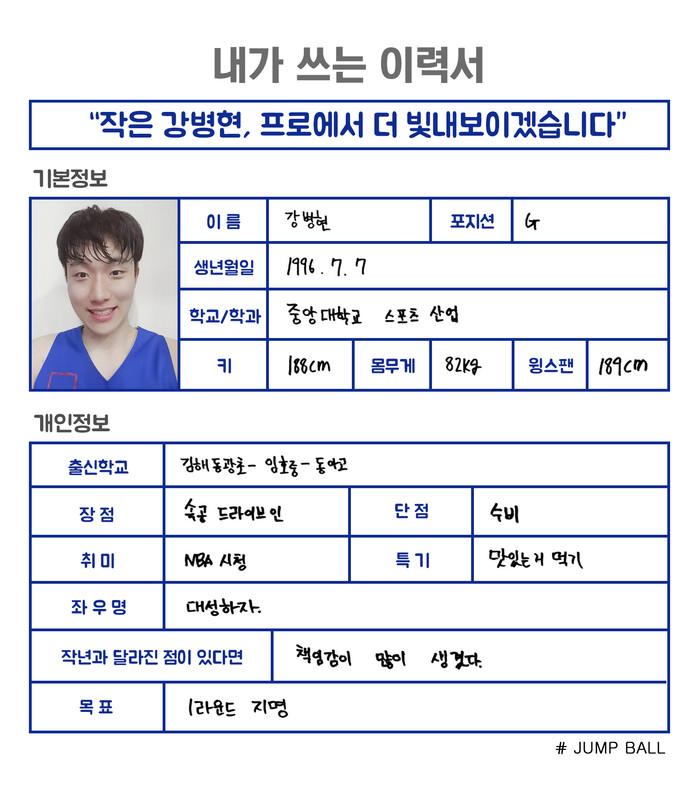 [점프볼=강현지 기자] 2018년 신인 드래프트에 도전하는 ‘예비 프로’가 쓰는 취업이력서. 20편의 주인공은 중앙대 주장 강병현(22, 188cm)이다. 창원 LG에서 새 시즌 맞이에 한창인 강병현을 롤 모델로 삼아 프로 선수의 꿈을 펼치고 있는 이가 있다. 바로 부산 출신 고향 후배 ‘작은 병현’이다. 속공 전개 능력, 또 어려운 상황에서 해결할 수 있는 모습을 살펴보면 중앙대 시절 큰 병현의 모습과도 비슷하다. 작은 병현이 큰 병현과 같은 무대에 뛰는 것을 그리며 프로 무대에 도전장을 냈다.