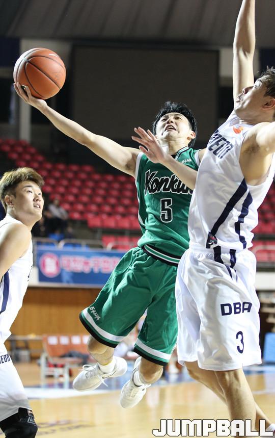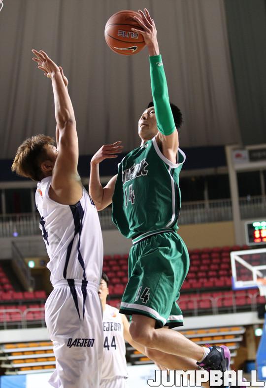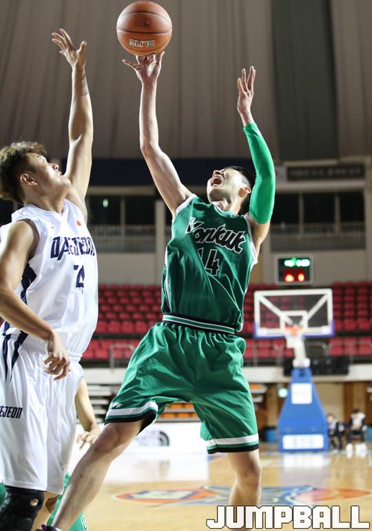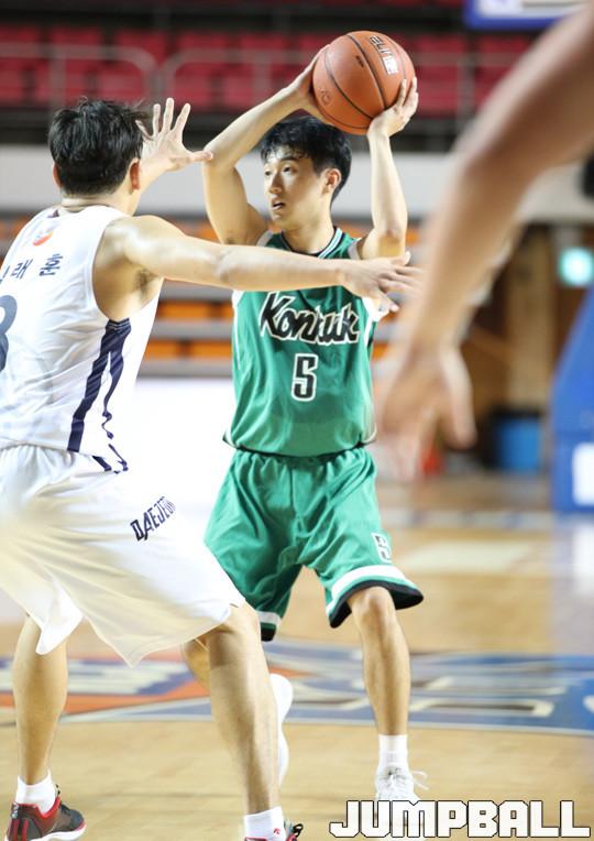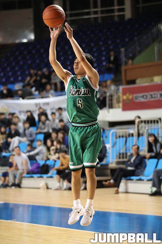 14일 전주 실내체육관에서 열린 제99회 전국체전 남자 일반부 경기, 충북대표 건국대가 난타전 끝에 가드 최진광의 맹활약 속에 82-77로 대전시농구협회에 승리 했다.