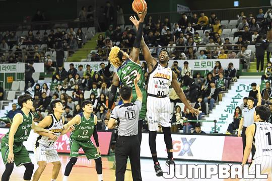 [점프볼=원주/홍기웅 기자] 17일 원주종합체육관에서 열린 '2018-2019 SKT 5GX 프로농구' 원주 DB와 창원 LG의 경기. 점프볼로 DB와 LG가 각각 패를 끊기 위한 경기를 진행하고 있다.