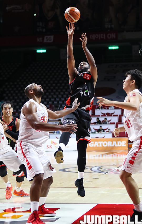 SK가 친정팀을 만나 펄펄 난 리온 윌리엄스의 활약 속에 2연패 탈출을 해냈다. 서울 SK는 20일 부산사직체육관에서 열린 2018-2019 SKT 5GX 프로농구 부산 KT와의 ‘통신사 더비’에서 94-82로 승리했다. 이날 승리로 SK는 KT 전 9연승 행진을 달리며 ‘천적’ 관계를 유지했다.