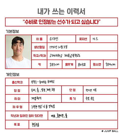 [점프볼=강현지 기자] 2018년 신인 드래프트에 도전하는 ‘예비 프로’가 쓰는 취업이력서. 22편의 주인공은 고려대 유태민(22, 183cm)이다. 지난 9월까지만 해도 크게 조명 받지 못한 유태민이 대학리그 정규리그 마지막 경기에서 스포트라이트를 자신에게로 가져왔다. 화려하진 않지만, 모처럼 성공시킨 위닝샷에 자신감을 얻은 것이다. 드래프트까지 시간이 얼마 남지 않은 가운데 그는 마지막 필살기를 보여주기 위해 마음가짐을 달리하고 있다.
