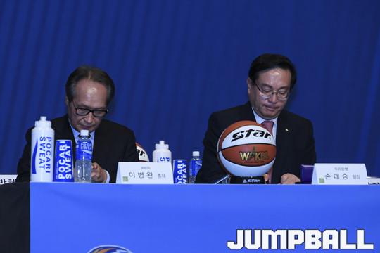 [JB포토] 타이틀 스폰서 조인식에 서명하는 이병완 WKBL 총재, 손태승 우리은행장