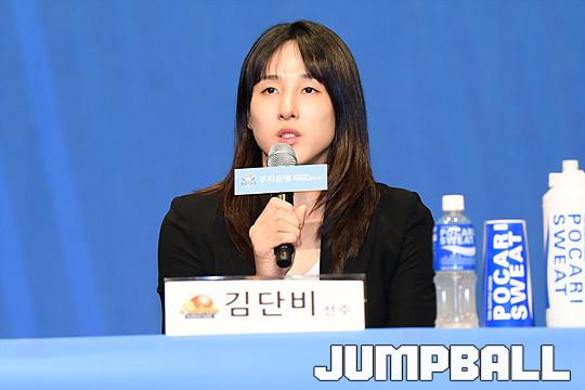 [점프볼=여의도/유용우 기자] 29일 서울 여의도 63컨벤션센터 2층 그랜드볼륨에서 우리은행 2018-2019 여자프로농구 타이틀스폰서 조인식 및 미디어데이가 열렸다. 신한은행 김단비가 새시즌 출사표를 던지고 있다.