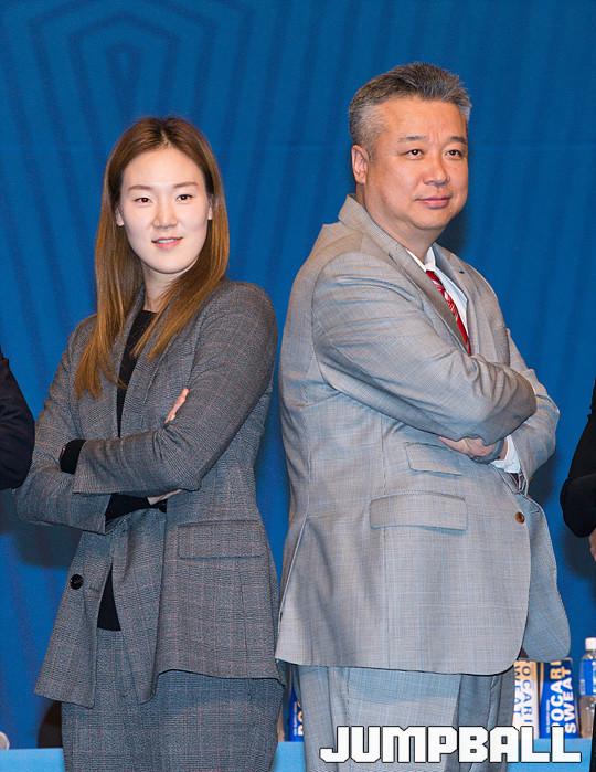 [점프볼=여의도/유용우 기자] 29일 서울 여의도 63컨벤션센터 2층 그랜드볼륨에서 우리은행 2018-2019 여자프로농구 타이틀스폰서 조인식 및 미디어데이가 열렸다. 삼성생명 임근배 감독과 배혜윤이 포즈를 잡으며 포토타임을 갖고 있다.