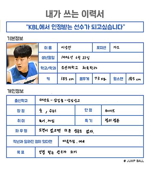 [점프볼=강현지 기자] 2018년 신인 드래프트에 도전하는 ‘예비 프로’가 쓰는 취업이력서. 23편의 주인공은 조선대 이상민(22, 183cm)이다. 농구계에서는 서울 삼성 이상민 감독 덕분에 익히 들어본 이름 석 자지만, 막상 그를 소개하면 인지도는 아직 동명이인인 이 감독보다 훨씬 떨어지는 게 사실. 그런 그가 “KBL에서 인정받고 싶다”며 프로무대에 도전장을 내밀었다. 슛과 수비에서는 자신 있다며 자신을 PR했다.