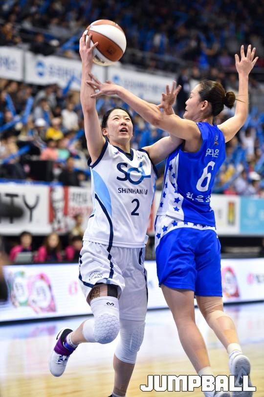 신한은행 에스버드 김규희가 상대수비를 피해 레이업슛을 시도하고 있다.