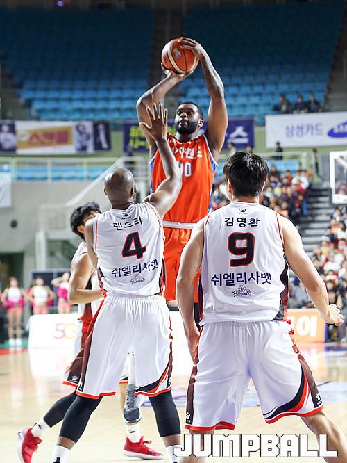 [점프볼=인천/한명석 기자] 4일 인천삼산체육관에서 열린 '2018-2019 SKT 5GX 프로농구' 인천전자랜드와 부산KT의 경기에서 인천 전자랜드 윌리엄 다니엘스 선수가 수비선수가 많아지자 점프슛을 시도하고 있다.