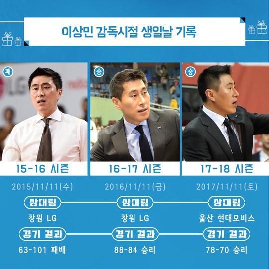 오는 11일 역시 전주 KCC와의 홈 맞대결이 기다리고 있다. 이상민 감독은 4시즌 연속 생일날 경기를 갖게 된 셈이다. 현재까지의 생일날 전적은 5승 1패. 과연 이상민 감독은 이번에도 승리라는 최고의 생일 선물을 받을 수 있을까?