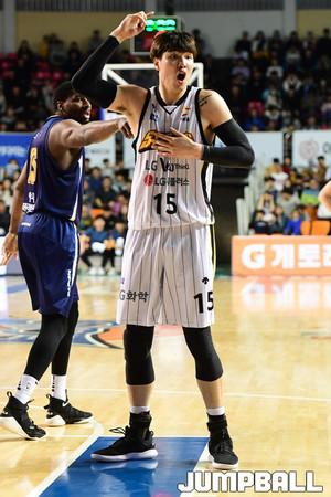 [점프볼=전주/박상혁 기자] 10일 전주실내체육관에서 2018-2019 SKT 5GX 프로농구 정규리그 전주KCC와 창원LG의 경기가 열렸다. LG 메이스가 공격상황에서 심판의 공격자 파울에 당황해 하고있다.