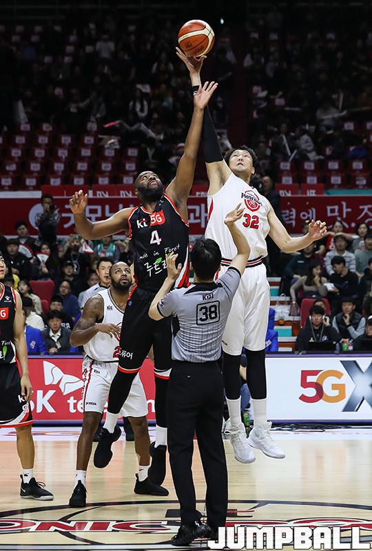 14일 부산 사직실내체육관에서 열린 '2018-2019 SKT 5GX 프로농구' 부산 kt와 울산 현대모비스 경기에서 kt 랜드리와 현대모비스 이종현이 점프볼을 하고 있다.