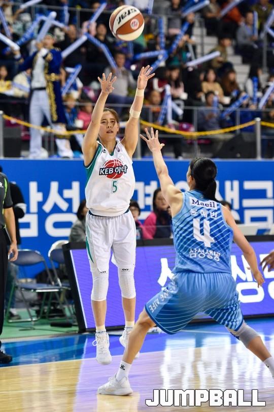 [점프볼=용인/윤희곤 기자] 15일 용인실내체육관에서 열린 ‘우리은행 2018-2019 여자프로농구’ 삼성생명 블루밍스와 KEB하나은행의 경기. 하나은행 김이슬이 사이드라인 부근에서 3점슛을 시도하고 있다.