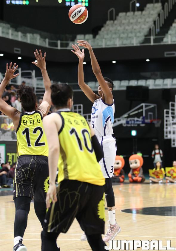 17일 서수원 칠보체육관에서 열린 ‘우리은행 2018-2019 여자프로농구’ OK저축은행 웃샷과 신한은행 에스버드의 경기, 신한은행에 새로운 외국인 선수 자신타 먼로가 중거리슛으로 공격을 펼치고 있다.