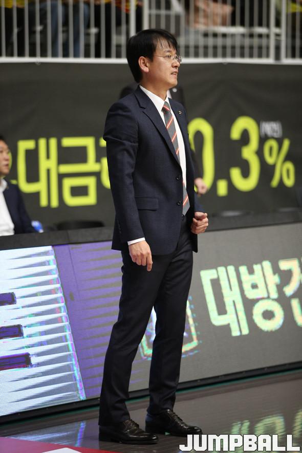 17일 서수원 칠보체육관에서 열린 ‘우리은행 2018-2019 여자프로농구’ OK저축은행 웃샷과 신한은행 에스버드의 경기. OK저축은행이 승리에 한 발 다가서자 정상일 감독이 다소 긴장이 풀린 듯한 모습으로 경기를 지켜보고 있다.
