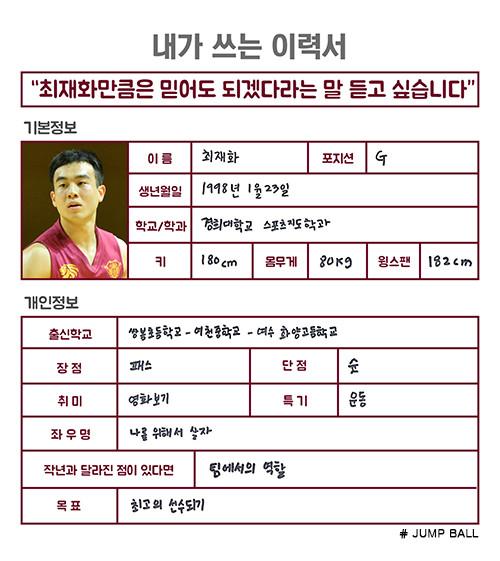 [점프볼=강현지 기자] 2018년 신인 드래프트에 도전하는 ‘예비 프로’가 쓰는 취업이력서. 26편의 주인공은 경희대 재학 중 프로 조기진출을 결정한 최재화(20, 179.3cm)다. 화려하진 않지만, 안정적인 경기 운영과 수비에 있어서는 팀에서 빼놓을 수 없는 선수다. 고득점을 기록하기보다는 꾸준하게 본인 장점에서 실력발휘를 하는 것이 최재화의 가장 큰 매력이다.