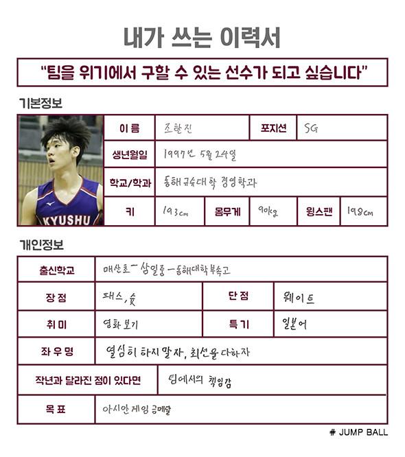 [점프볼=강현지 기자] 2018년 신인 드래프트에 도전하는 ‘예비 프로’가 쓰는 취업이력서. 29편의 주인공은 일본에서 커리어를 쌓다가 일반인자격으로 드래프트에 참가한 동해규슈대(중퇴) 조한진(21, 192.7cm)이다. 학업을 위해 떠난 곳이었지만, 농구에 대한 열정을 쉽게 져버리지 못한 조한진은 결국 최종 꿈을 프로선수로 조준했다. 지난 9월 한국을 찾은 그는 오는 26일, 2018 국내신인선수 드래프트에 참가한다.