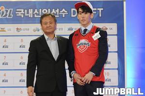 [점프볼=잠실/홍기웅 기자] 26일 잠실학생체육관에서 '2018 KBL 국내신인선수 DRAFT'가 열렸다. 1라운드 6순위로 전현우가 지명돼 유도훈 감독이 유니폼을 손수 입혀주고 있다.