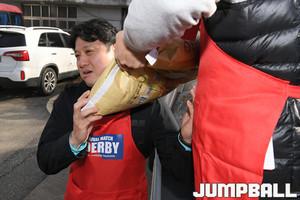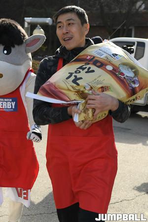 [점프볼=양지/홍기웅 기자] 28일 양지바른 장애인 거주시설에서 '2018-2019 SKT 5GX 프로농구' S더비 사랑의 쌀 전달식이 진행됐다. 이번 사랑의 쌀 전달식은 SK와 삼성의 이번시즌 양팀간에 2번의 맞대결을 통해 2승을 한 문경은 감독이 142만원, 2패를 한 이상민 감독이 124만원을 적립해 총 266만원을 적립해서 구매한 1000kg의 쌀로 장애인 복지시설에 전달식을 진행했다. 삼성 이상민 감독이 잠깐 쉬는 시간 동안 자유투 대결 규칙을 듣고 얘기를 하고 있다.